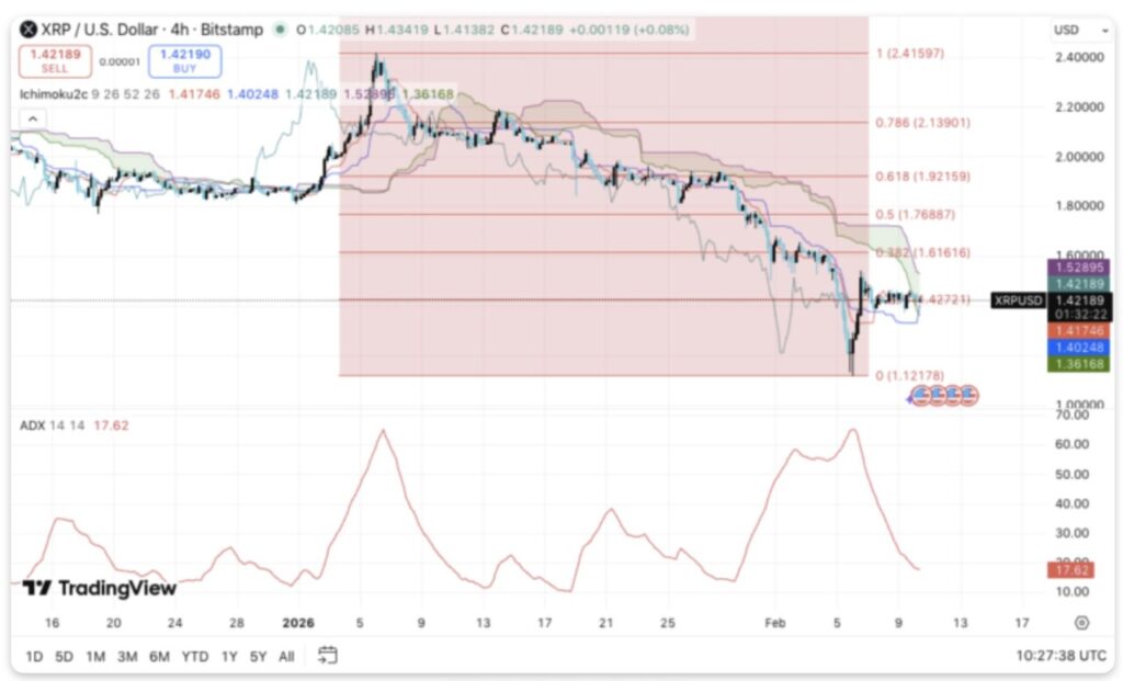 XRP masih bergerak turun setelah gagal menembus area $2,40–$2,30 pada awal tahun ini. Yang cukup penting, harga tetap berada di bawah awan Ichimoku, menegaskan struktur penurunan yang masih berlanjut.