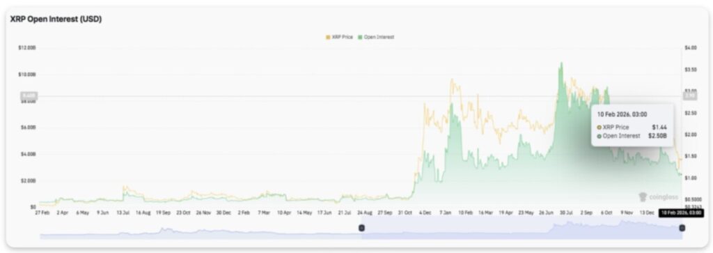 Data derivatif XRP menunjukkan siklus leverage yang sudah tuntas. Open interest sempat naik tajam pada akhir kuartal IV ketika harga melonjak. Namun setelah itu, open interest mulai menurun di saat volatilitas meningkat.