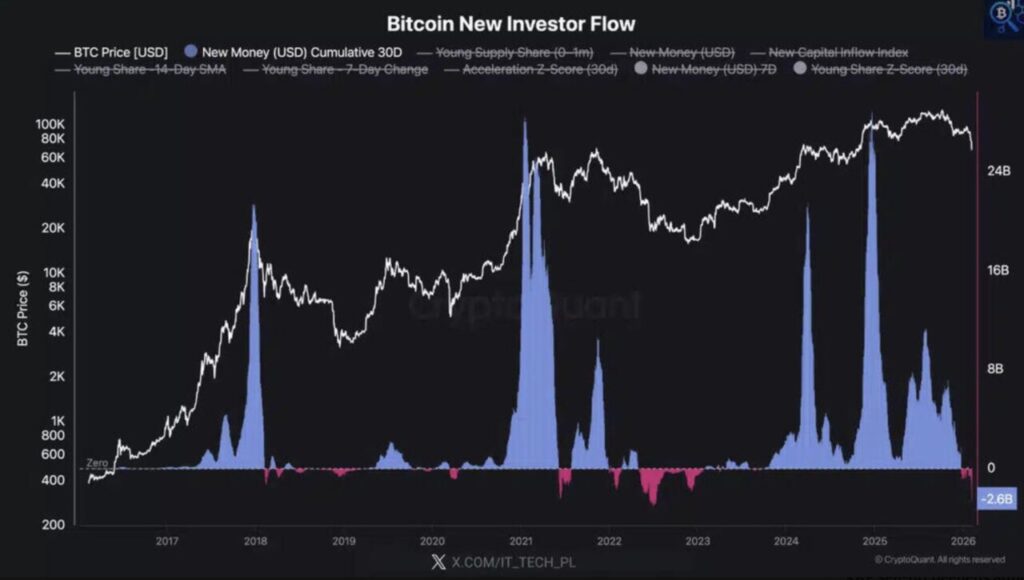 Dalam 30 hari terakhir, sekitar US$2,6 miliar modal bersih keluar dari Bitcoin. Dalam kondisi pasar yang lebih kuat, penurunan harga biasanya menarik pembeli baru. Namun sekarang, jumlah pembeli yang masuk belum cukup besar untuk menahan tekanan jual.