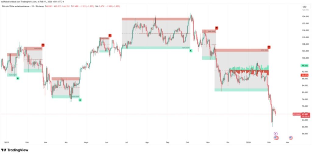 Bitcoin jatuh ke titik terendah lokal di $66.529 dan gagal kembali menembus level $70.000. Pada 11 Februari, BTC sempat diperdagangkan di sekitar $66.975, turun 3,11% dalam 24 jam dan 12,61% dalam sepekan terakhir. Penurunan ini terjadi setelah periode tekanan jual berkepanjangan yang dimulai ketika Bitcoin tidak mampu bertahan di atas $97.000 beberapa minggu lalu.