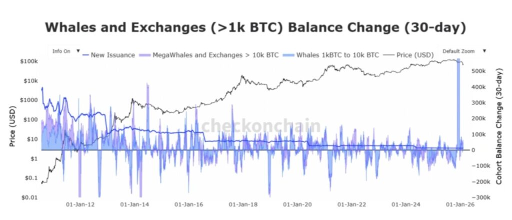 Whale yang menyetorkan BTC senilai $172 juta tadi bukan kasus tunggal. Data dari Checkonchain menunjukkan bahwa gabungan kelompok whale dan mega-whale menjual sekitar 37.000 BTC hanya dalam satu hari, sementara total saldo BTC mereka di bursa — yang seminggu sebelumnya berada di kisaran 63.000 BTC — tercatat menurun.