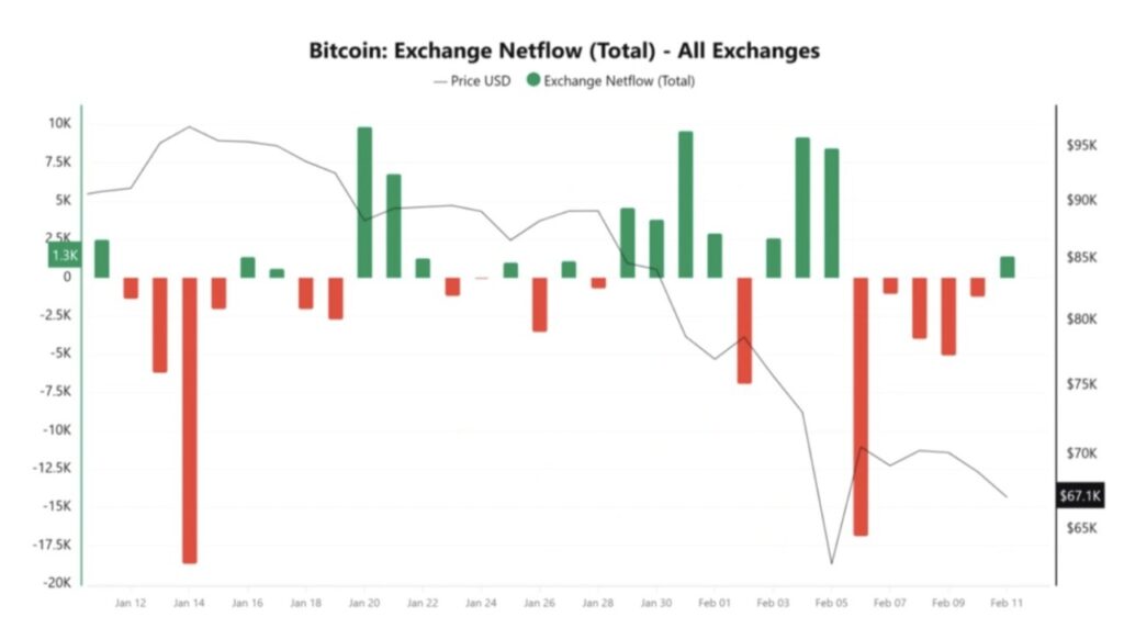 Menurut CryptoQuant, Exchange Netflow naik ke +1.300 BTC, dengan total arus masuk (inflow) mencapai 6.600 BTC pada saat penulisan. Netflow positif berarti lebih banyak pemegang memindahkan koin mereka ke bursa — sinyal yang secara konsisten dikaitkan dengan niat untuk menjual di pasar spot.
