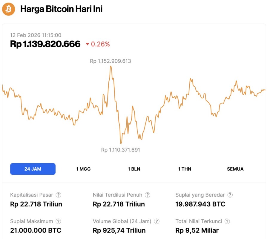 Pada 12 Februari 2026,Ā harga BitcoinĀ tercatat berada di level $67,565 atau setara dengan Rp1.139.820.666 mengalami koreksi 0,26% dalam 24 jam terakhir. Sepanjang periode ini, BTC menyentuh level terendahnya di Rp1.110.371.691 dan harga tertingginya di Rp1.152.909.613.