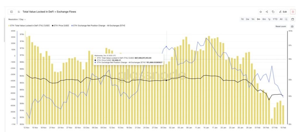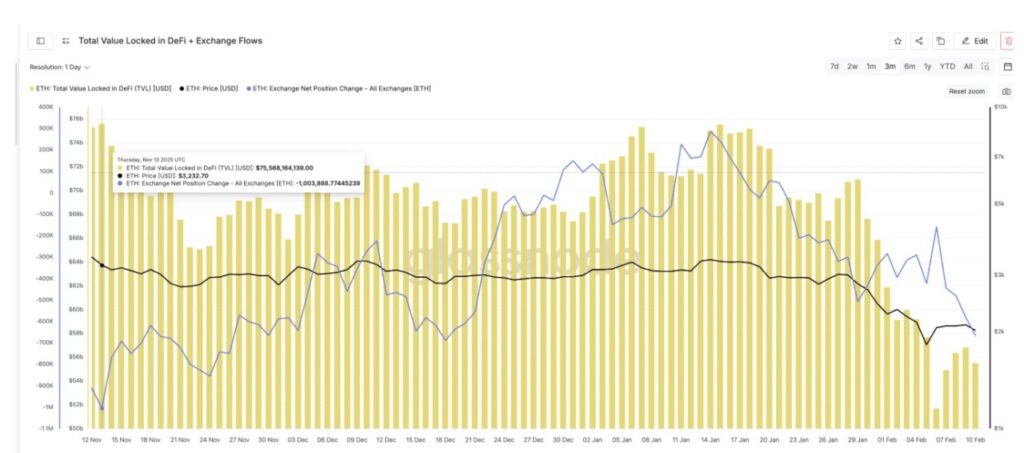 Analis laman BeInCrypto menggabungkan data TVL dan arus keluar–masuk bursa untuk menunjukkan satu pola yang jelas. Pada 13 November, TVL DeFi berada di kisaran $75,6 miliar. Di waktu yang sama, ETH diperdagangkan sekitar $3.232.