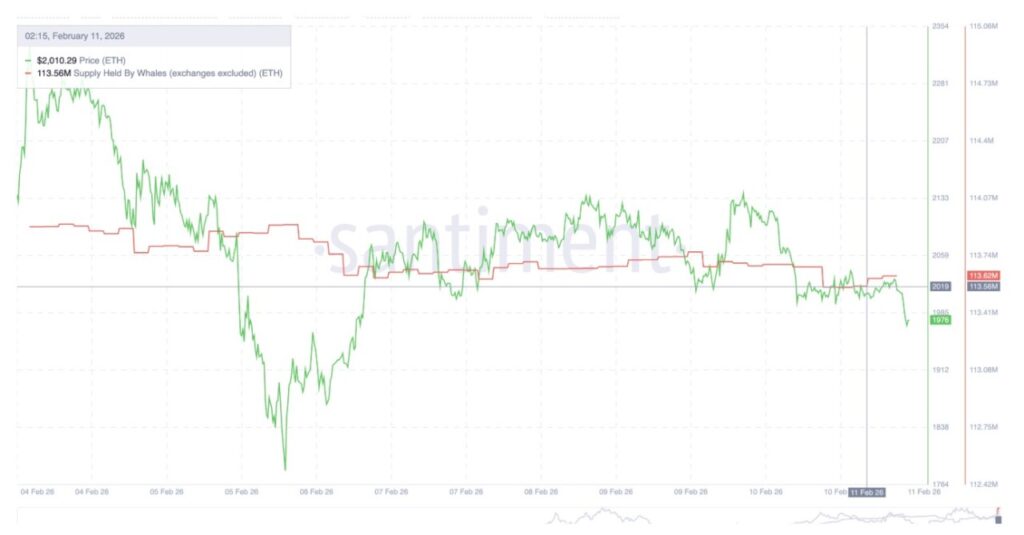 Whale supply mengukur seberapa banyak ETH yang dipegang oleh dompet besar (di luar bursa). Sejak 6 Februari, kepemilikan whale turun dari sekitar 113,91 juta ETH menjadi kurang lebih 113,56 juta ETH. Ini mengonfirmasi adanya distribusi (jual) saat harga breakdown. Namun, dalam 24 jam terakhir, tren ini berhenti.