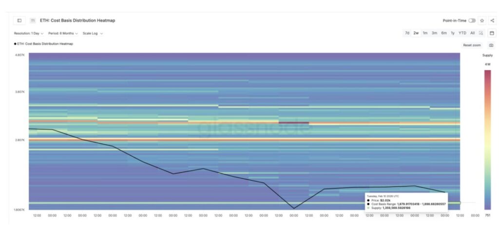 Cost basis heatmap menunjukkan di kisaran harga berapa banyak kelompok investor besar membeli koin mereka. Zona-zona ini sering bertindak sebagai support karena para holder cenderung mempertahankan harga masuk mereka. Untuk Ethereum, terdapat satu klaster besar di rentang $1.879 – $1.898. Sekitar 1,36 juta ETH dibeli di area ini. Itu menjadikannya zona permintaan yang kuat.