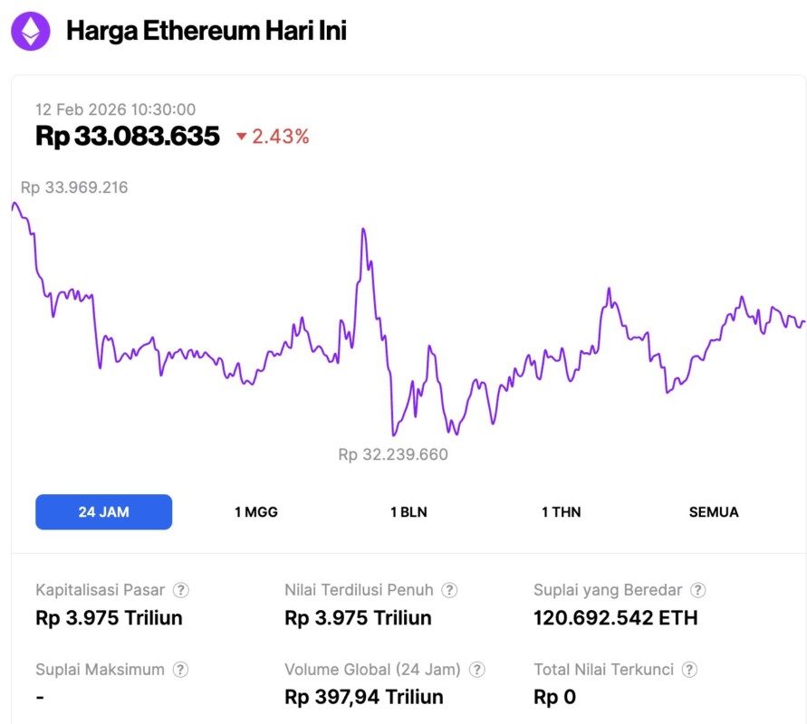 Pada 12 Februari 2026, harga Ethereum tercatat berada di sekitar $1,960 atau setara dengan Rp33.083.635 mengalami penurunan 2,43% dalam 24 jam terakhir. Sepanjang periode ini, ETH sempat menyentuh level terendahnya di Rp32.239.660 dan level tertingginya di Rp33.969.216