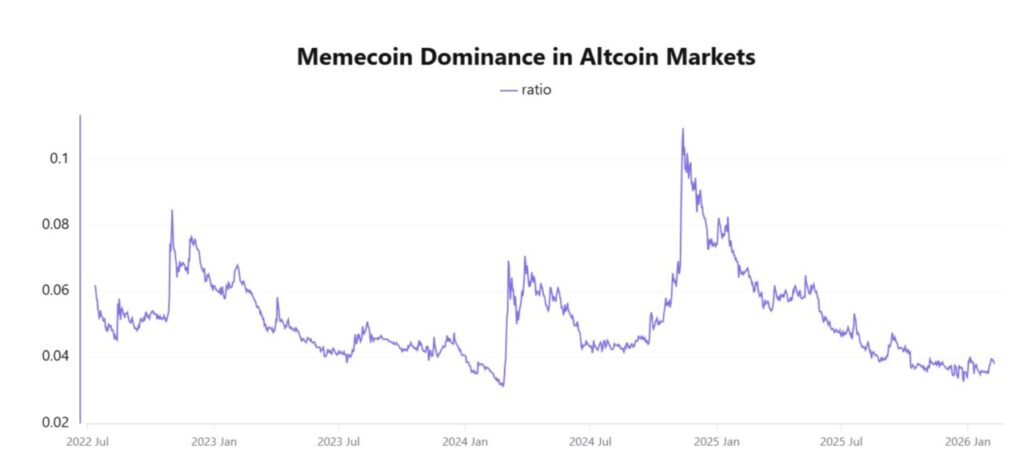 Data tentang dominasi meme coin di pasar altcoin—yang mengukur pangsa kapitalisasi pasar meme coin terhadap total kapitalisasi altcoin—juga masih berada di level rendah.