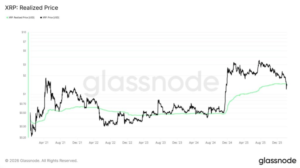 Gambaran makro untuk XRP saat ini banyak bertumpu pada metrik realized price. Realized price menggambarkan rata-rata harga beli seluruh koin yang beredar, sehingga memberikan pandangan yang lebih jelas soal posisi agregat investor dibanding hanya melihat harga spot.