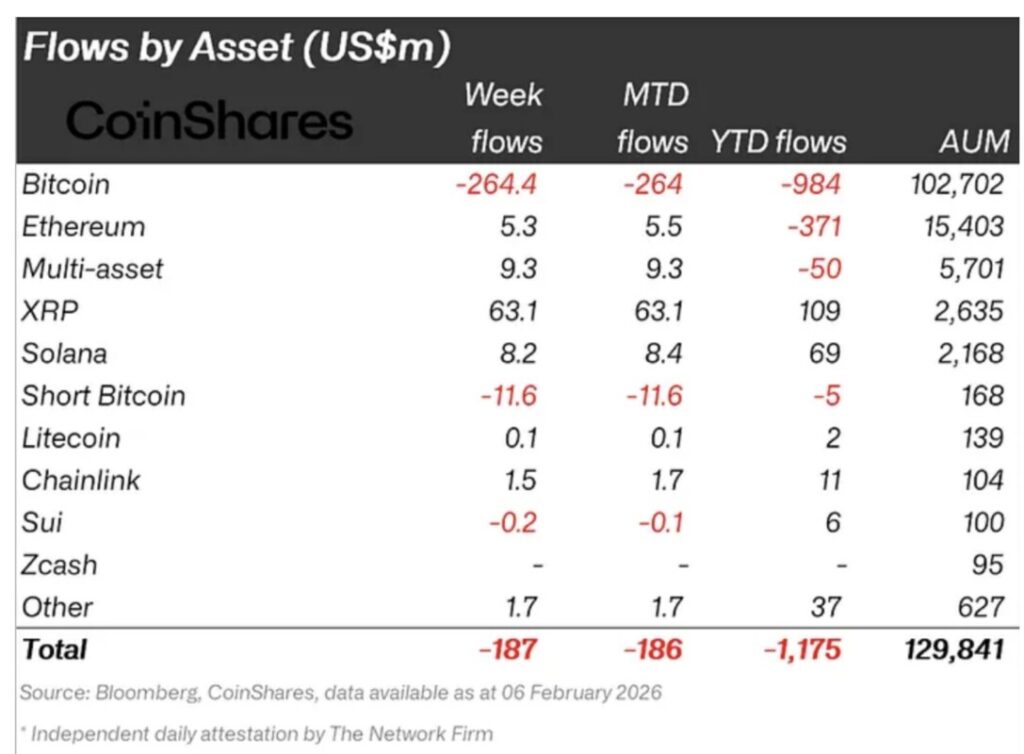 Meski investor ritel cenderung berhati-hati, minat dari investor institusional terhadap XRP masih berlanjut. Berdasarkan data CoinShares, XRP mencatat arus masuk dana sebesar $63,1 juta pada pekan yang berakhir 6 Februari. Kinerja ini bahkan melampaui Bitcoin, Ethereum, dan Solana dalam periode yang sama.