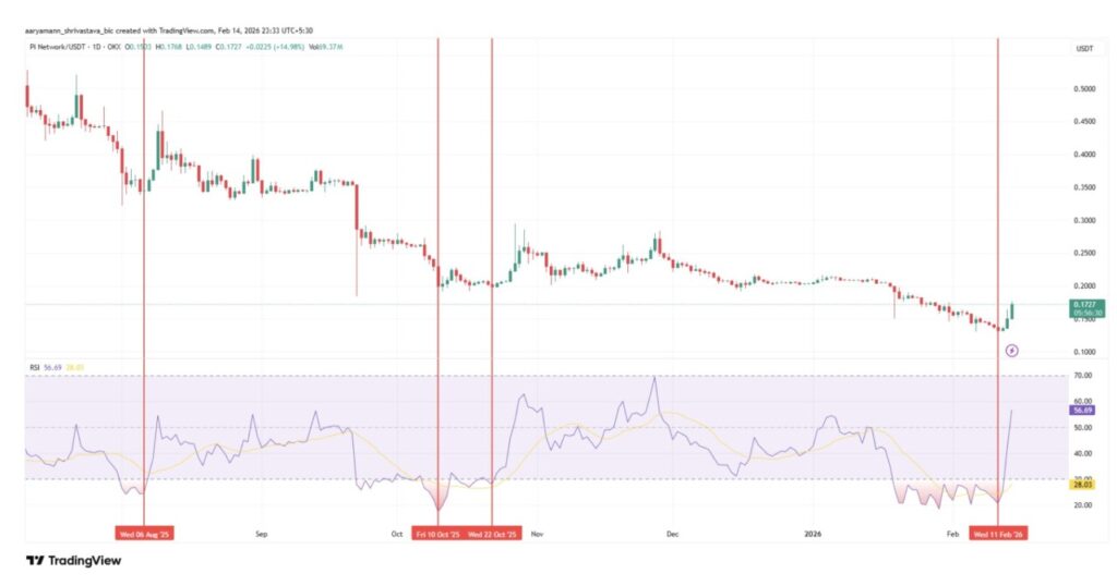 Indikator Relative Strength Index (RSI) menunjukkan Pi Coin kembali menguat setelah hampir sebulan berada di area oversold (jenuh jual). Umumnya, RSI di bawah 30 menandakan tekanan jual yang besar. Dalam kasus ini, sentimen bearish yang berkepanjangan muncul setelah pelemahan pasar secara luas.