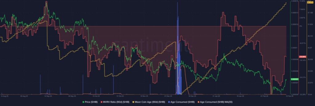 Analisis metrik on-chain seperti age consumed dan mean coin age menunjukkan dinamika pasar yang menarik: terdapat aktivitas transaksi dari SHIB yang telah lama tidak bergerak. Peningkatan metrik tersebut menunjukkan adanya akumulasi oleh pemegang jangka panjang, bahkan ketika harga turun dari level sebelumnya.