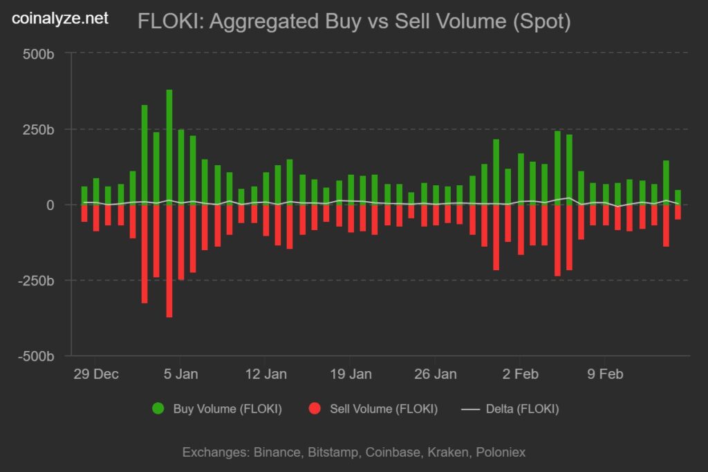 Data on-chain menunjukkan akumulasi besar baik oleh whale maupun partisipan ritel. Buy-sell delta positif menunjukkan 349 miliar token FLOKI dibeli dibandingkan 326 miliar dijual, yang berarti ada akumulasi agresif di pasar spot. Whale buy activity juga meningkat signifikan, dengan whale membeli sekitar 203,4 miliar token—jauh di atas rata-rata volume.