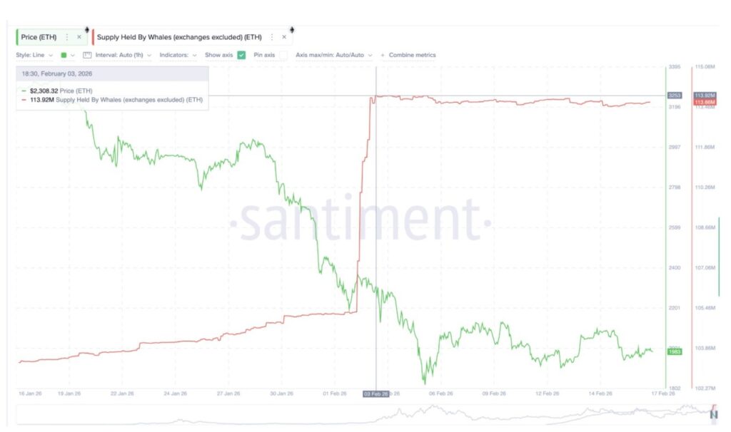 Selama periode ketika harga Ethereum berusaha pulih, investor besar justru terlihat mengurangi eksposur. Dompet yang menyimpan ETH dalam jumlah besar—sering disebut whale—menurunkan kepemilikannya dari 113,92 juta ETH menjadi 113,66 juta ETH. Itu berarti berkurang sekitar 260.000 ETH, setara kurang lebih $500 juta.