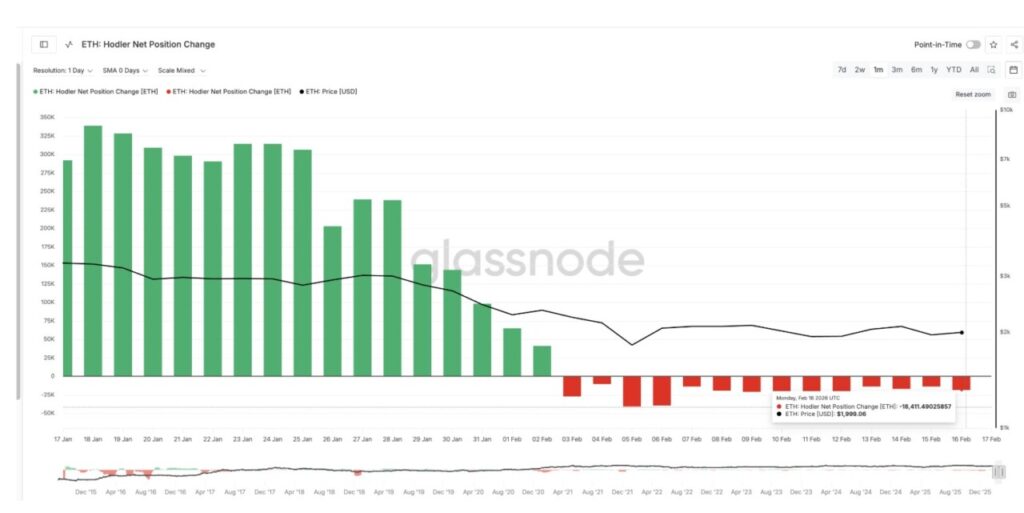 Pada Ethereum, Holder Net Position Change tetap berada di zona negatif antara 3 Februari hingga 16 Februari (fase rebound). Bahkan, tekanan jual meningkat dari -13.677 ETH menjadi -18.411 ETH, atau naik sekitar 34%.