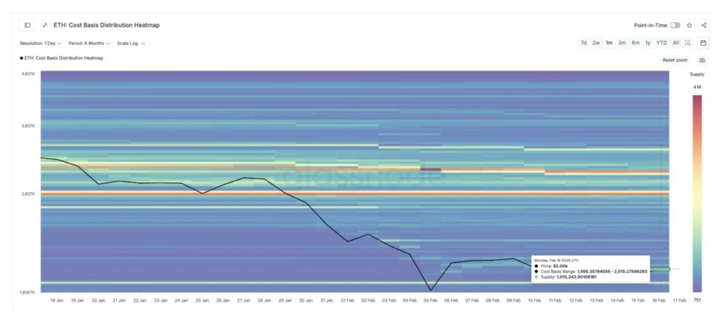 Klaster cost basis terbesar saat ini berada di kisaran $1.995–$2.015. Lebih dari 1,01 juta ETH dibeli pada rentang ini. Akibatnya, muncul tekanan jual yang kuat.