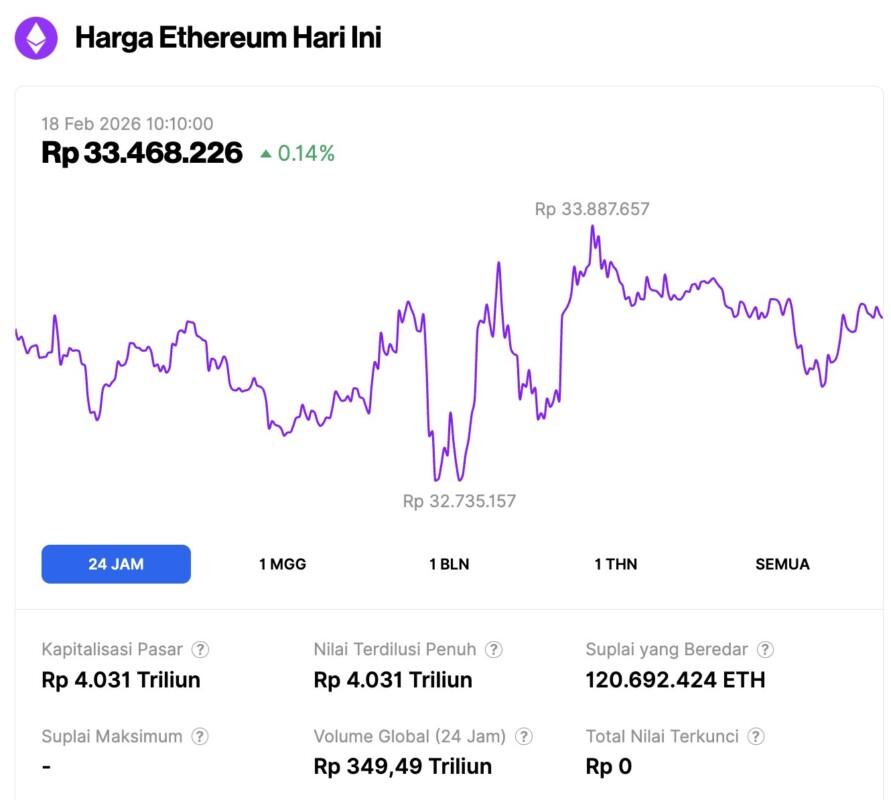 Pada 18 Februari 2026,Ā harga EthereumĀ tercatat berada di sekitar $1,986 atau setara dengan Rp33.468.226 mengalami kenaikan tipis 0,14% dalam 24 jam terakhir. Sepanjang periode ini, ETH sempat menyentuh level terendahnya di Rp32.735.157 dan level tertingginya di Rp33.887.657.