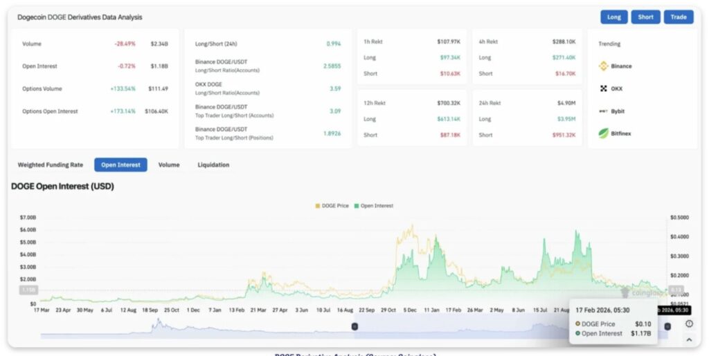 Berdasarkan data Coinglass, open interest Dogecoin turun 0,72% menjadi $1,18 miliar meskipun harga naik 18%. Volume juga merosot 28,49% menjadi $2,34 miliar. Turunnya open interest saat harga naik mengindikasikan reli kemungkinan didorong sebagian oleh short covering (penutupan posisi short), bukan masuknya posisi long baru dalam jumlah besar.