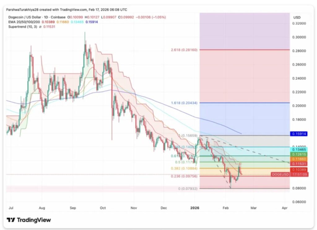 Pada grafik harian (17/2), Dogecoin sedang menguji level retracement Fibonacci 0,382 di $0,1088 setelah memantul dari titik rendah $0,079. Level Fibonacci 0,5 berada di $0,1179, sementara 0,618 di $0,1270 menjadi klaster resistensi utama berikutnya. Indikator Supertrend berbalik bearish di $0,1153, menegaskan bahwa penjual masih memegang kendali atas tren harian.