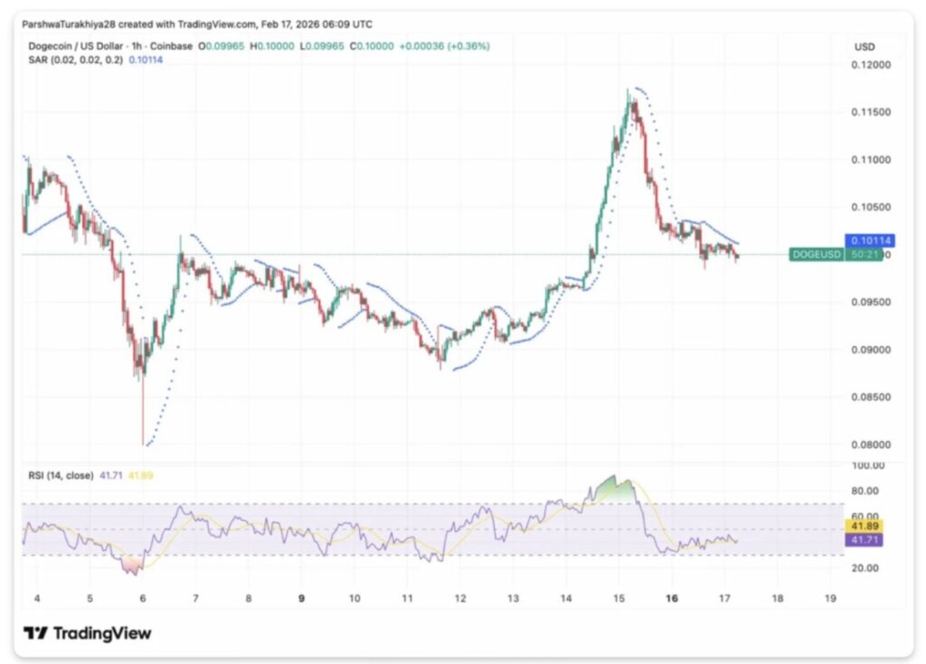 Pada grafik 1 jam (17/2), DOGE terlihat berkonsolidasi di sekitar $0,10 setelah lonjakan tajam hingga $0,115. Indikator Parabolic SAR berada di $0,10114 dan bertindak sebagai resistensi terdekat. RSI bertahan di 41,71—masih relatif netral, namun cenderung melemah seiring harga mengembalikan sebagian kenaikan dari reli pasca-pengumuman.