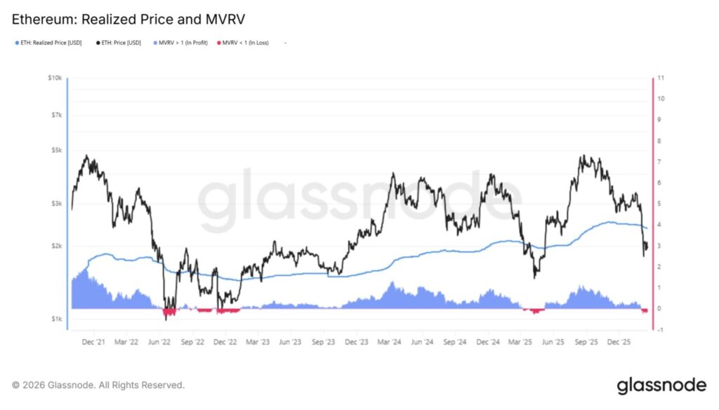 Sejak akhir Januari, harga Ethereum anjlok dan terus tertahan di bawah level Harga Realisasi (Realized Price). Indikator on-chain ini mencerminkan rata-rata modal pembelian seluruh koin yang beredar, sehingga pergerakan di bawah level tersebut menandakan mayoritas investor saat ini sedang merugi.