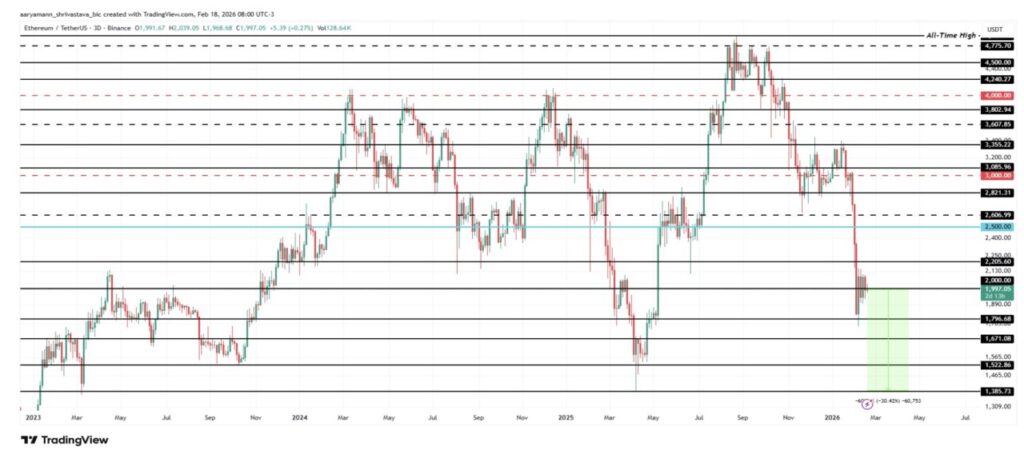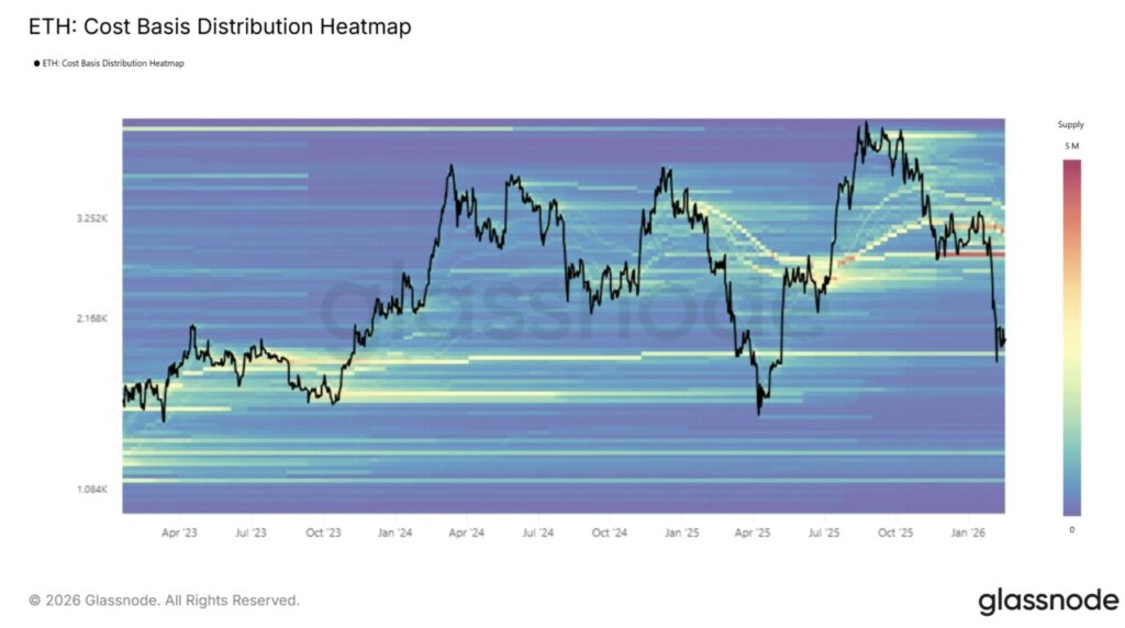 Zona support tersebut mencerminkan aktivitas akumulasi di masa lalu. Jika harga ETH menembus ke bawah $1.866, risiko pelemahan akan meluas hingga ke level $1.385. Titik ini sebelumnya telah menjadi dasar struktural pada siklus lalu. Penurunan ke area $1.385 setara dengan anjloknya harga sekitar 30% dari posisi sekarang. Adapun support mayor berikutnya berada di kisaran $1.231.