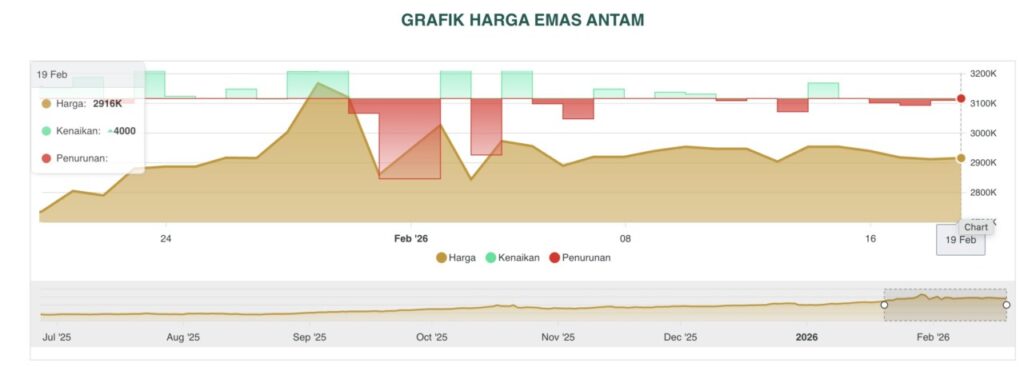 Data dari grafik harga emas Antam di atas menunjukkan bahwa pasar emas mengalami pergerakan positif dengan kenaikan harga sebesar Rp4.000 per gram pada 19 Februari 2026.