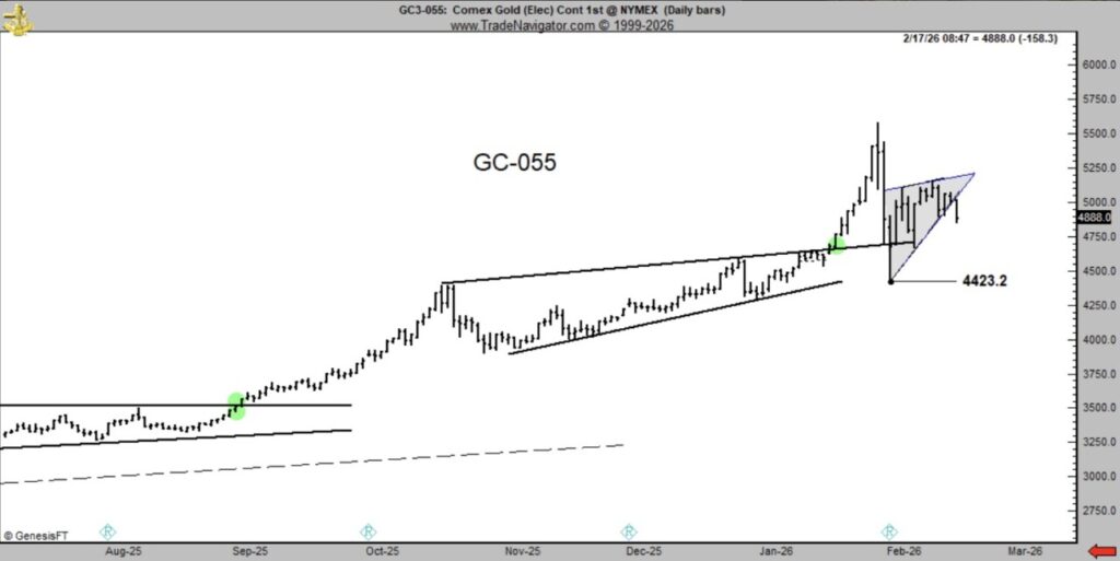 Analisis grafik klasik Peter Brandt menunjukkan bahwa pergerakan harga emas baru-baru ini membentuk pola koreksi rising wedge. Brandt memprediksi penurunan “textbook” dengan target uji awal di level $4.430, dan potensi koreksi lebih dalam hingga ke $4.000.