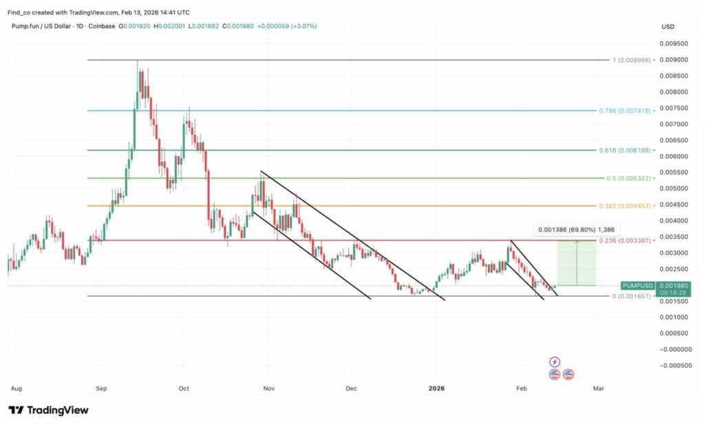Pump.fun berada dalam tren turun makro yang jelas sejak mencapai puncak blow-off di sekitar 0,009, ditandai oleh pola lower high dan lower low. Meski begitu, PUMP termasuk salah satu crypto yang berpotensi tampil baik setelah Hari Valentine.