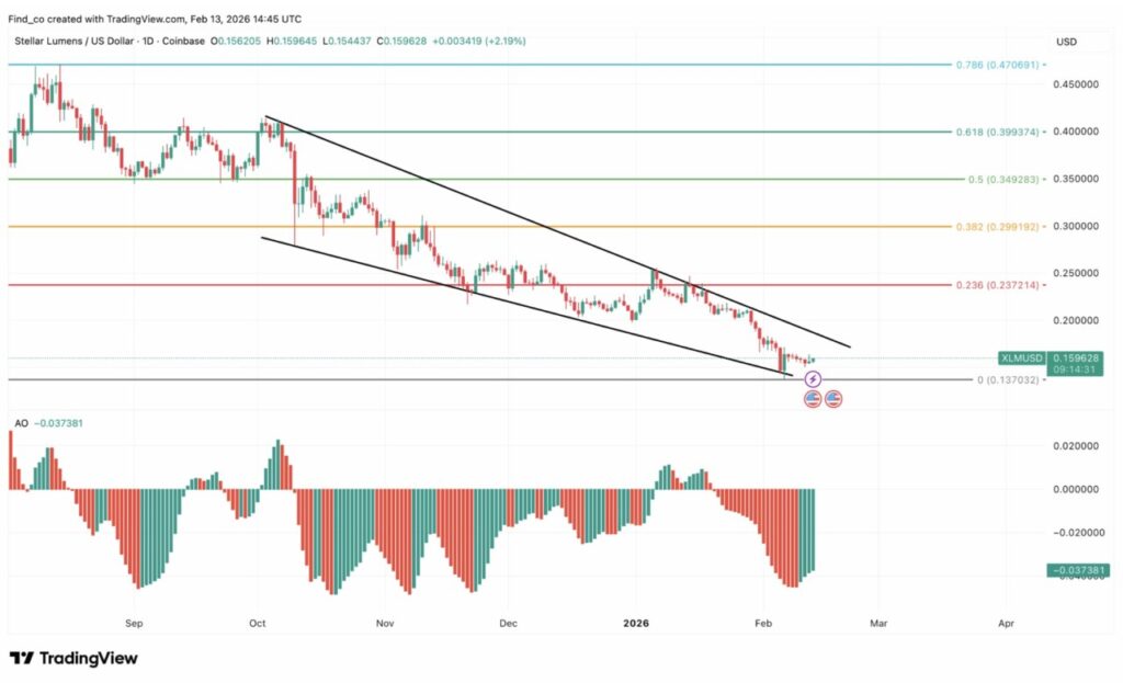 Harga Stellar masih bergerak di dalam descending channel pada timeframe harian, dengan pola lower high dan lower low yang konsisten. Saat ini harga berada sedikit di atas support horizontal utama di 0,137, yang juga sejalan dengan batas bawah kanal tersebut.