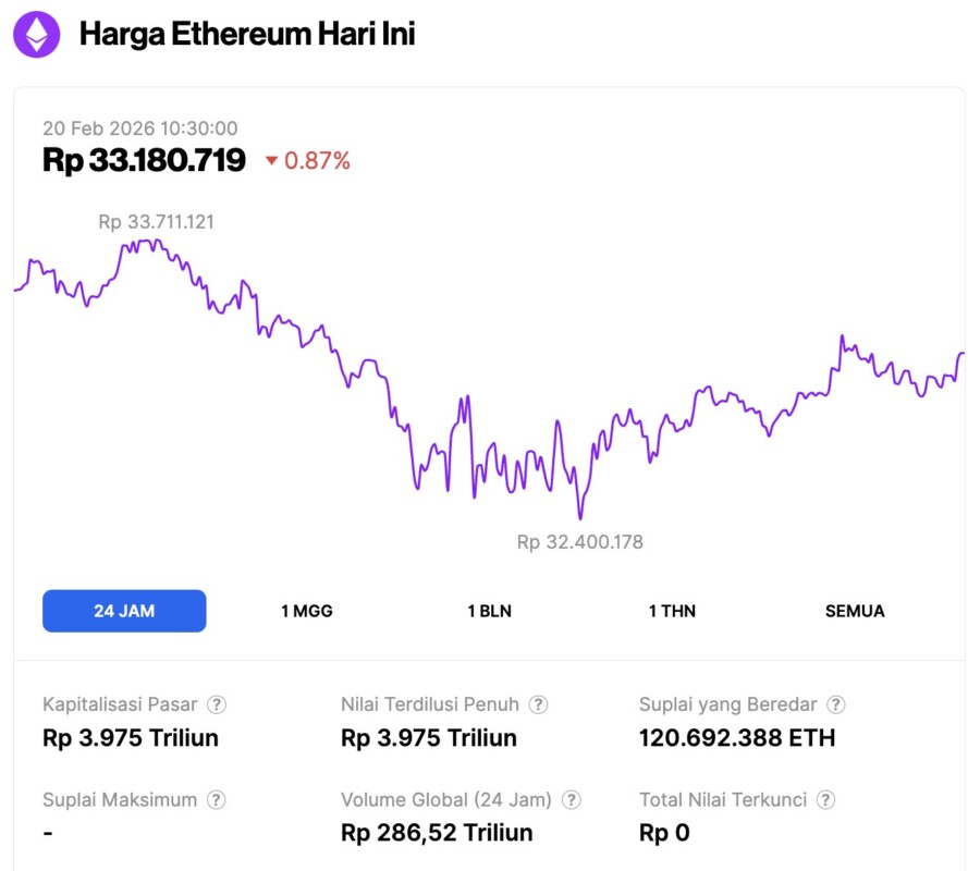 Pada 20 Februari 2026, harga Ethereum tercatat berada di sekitar $1,957 atau setara dengan Rp33.180.719 mengalami kenaikan koreksi 0,87% dalam 24 jam terakhir. Sepanjang periode ini, ETH sempat menyentuh level terendahnya di Rp32.400.178 dan level tertingginya di Rp33.711.121.