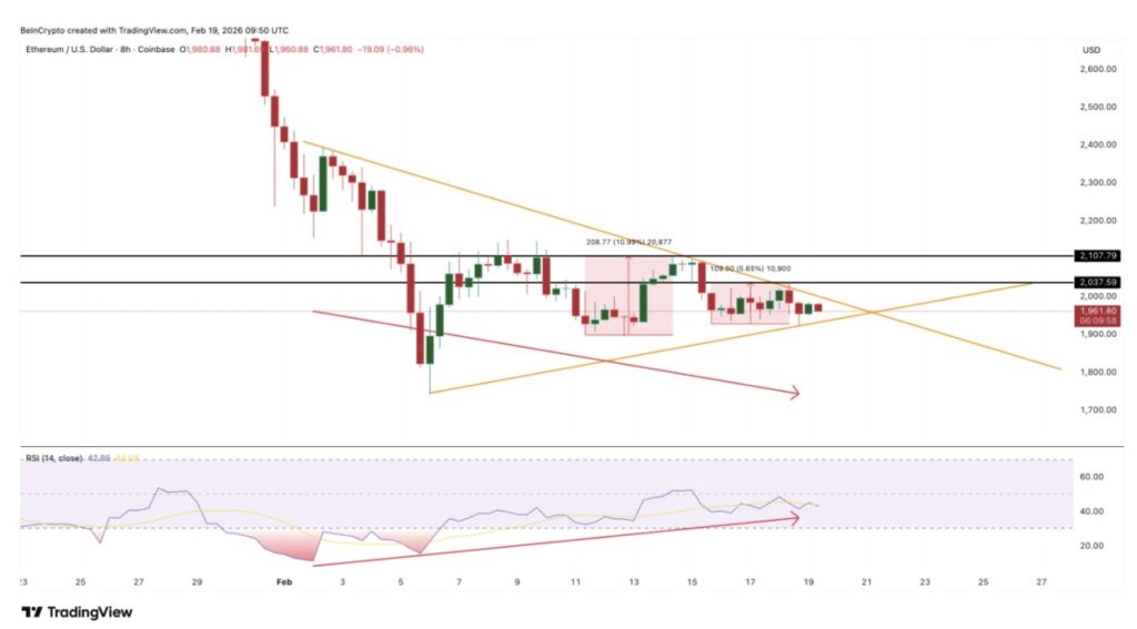 Dari tanggal 2 hingga 18 Februari, harga Ethereum sempat menyentuh level terendah baru (lower low), yang berarti harganya anjlok melewati batas support sebelumnya. Akan tetapi, pada periode yang sama, indikator Relative Strength Index (RSI)—yang mengukur kekuatan beli dan jual—justru mencatatkan titik terendah yang lebih tinggi (higher low).