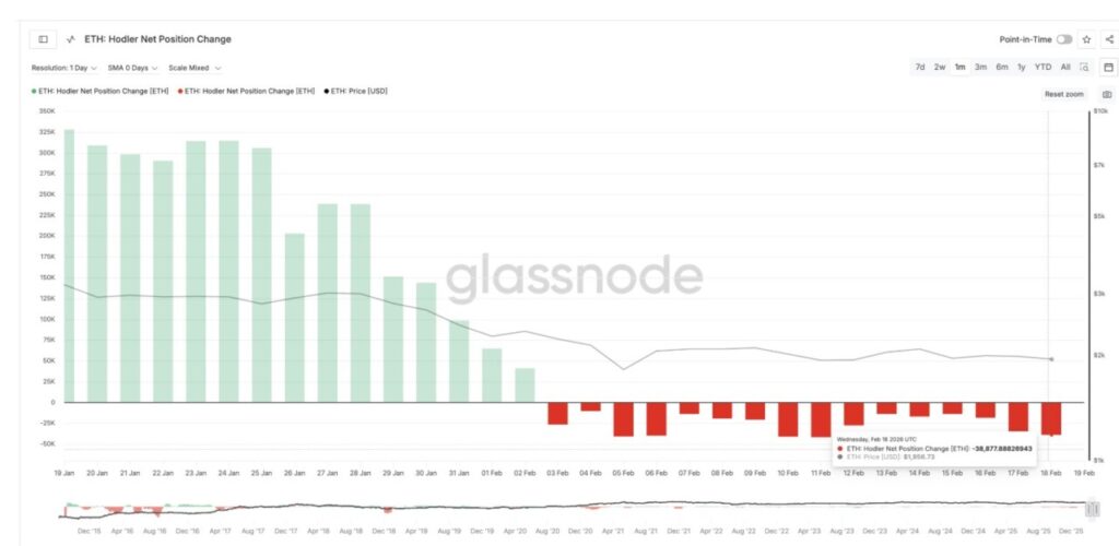Sebagai gambaran, pada 17 Februari, investor jangka panjang tercatat menjual 34.841 ETH dalam kurun waktu 30 hari terakhir. Hanya dalam waktu satu hari (18 Februari), angka tersebut melonjak tajam menjadi 38.877 ETH. Lonjakan tekanan jual ini terjadi tepat saat sinyal positif (bullish divergence) sedang terbentuk.