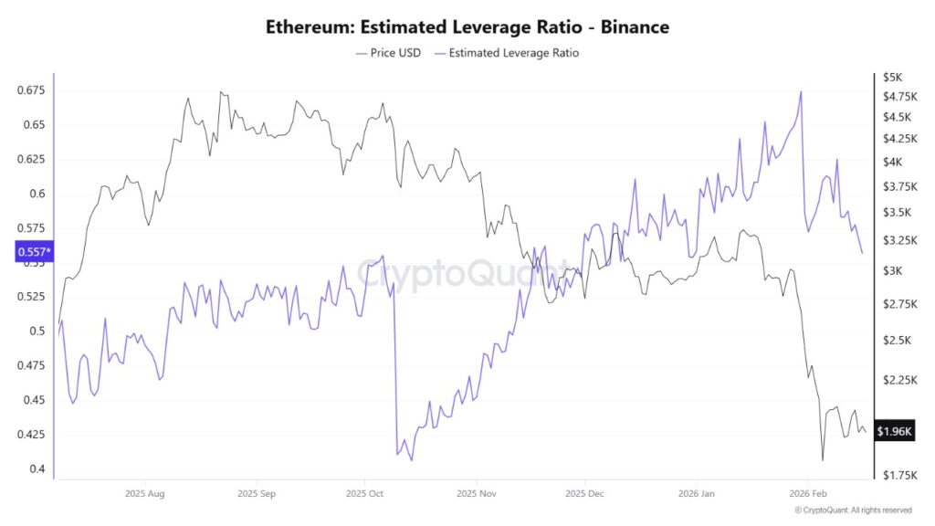 Berdasarkan analisis terbaru dari CryptoQuant, rasio leverage (Estimated Leverage Ratio) untuk Ethereum di bursa Binance baru saja merosot ke angka 0,557. Angka ini merupakan level terendah sejak Desember tahun lalu, setelah sebelumnya sempat memuncak di angka 0,675 saat pasar sedang dalam fase agresif. Penurunan ini menandakan bahwa banyak trader telah menutup posisi “pinjaman” mereka yang berisiko tinggi dan beralih ke strategi investasi yang lebih konservatif.