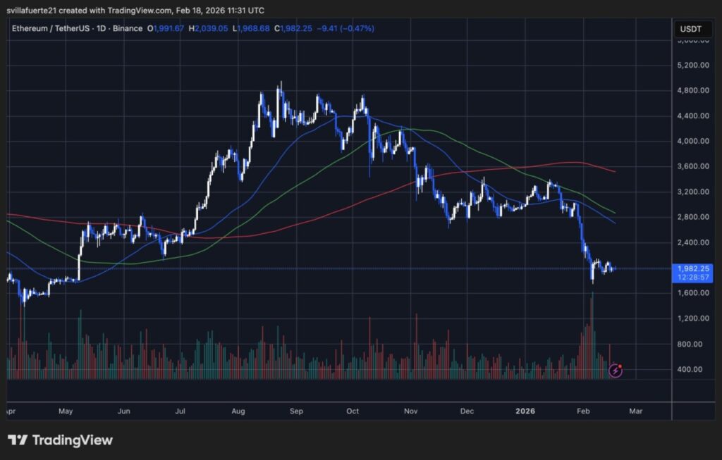 Meskipun tekanan jual masih terasa, area harga antara $1.900 hingga $2.000 (sekitar Rp32.085.300 – Rp33.774.000) kini berfungsi sebagai zona stabilisasi jangka pendek. Secara teknis, Ethereum masih berada di bawah garis rata-rata pergerakan 200 hari, yang saat ini menjadi tembok resistensi utama yang harus ditembus untuk mengonfirmasi pembalikan tren. Namun, volume perdagangan yang mulai melandai menunjukkan bahwa fase distribusi atau penjualan besar-besaran mungkin mulai mencapai titik jenuh.