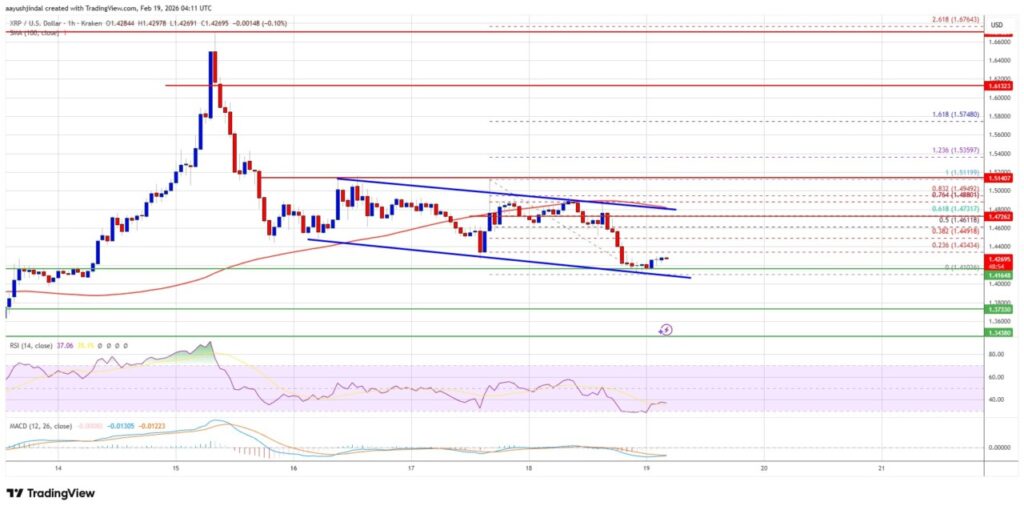 Kondisi pasar saat ini menunjukkan bahwa Ripple (XRP) telah kehilangan momentum setelah tergelincir di bawah zona $1,450 atau sekitar Rp24.486. Penurunan ini semakin diperparah dengan harga yang terus meluncur hingga menembus titik terendah lokal di angka $1,410 atau setara Rp23.810. Saat ini, mata uang kripto tersebut diperdagangkan di bawah garis rata-rata pergerakan 100 jam, yang secara teknis mengonfirmasi bahwa kendali pasar masih berada di tangan para penjual (bears).
