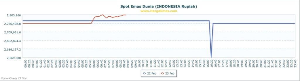 Berdasarkan data terbaru hingga pukul 09:00 WIB, indikator harga emas spot dunia menunjukkan performa sebagai berikut: