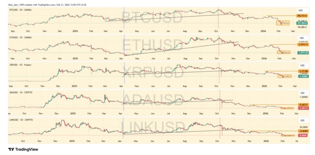 Proyeksi jangka pendek menetapkan level pemulihan potensial di sekitar $98.737 untuk BTC/USD, $3.474 untuk ETH/USD, $2,37 untuk XRP/USD, $0,49 untuk ADA/USD, dan $14,84 untuk LINK/USD. Ini bukanlah target “to the moon”, melainkan penanda resistensi struktural.