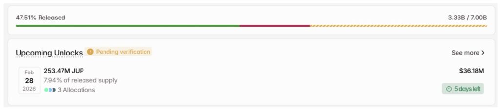 Pada tanggal 28 Februari, Jupiter akan membuka 253,47 juta JUP, yang bernilai sekitar $36,18 juta. Jumlah altcoin ini mewakili 7,94% dari pasokan yang telah beredar. Hal ini menandai peningkatan yang signifikan dibandingkan pembukaan kunci bulanan rutin Jupiter yang biasanya sebesar 53,47 juta token.