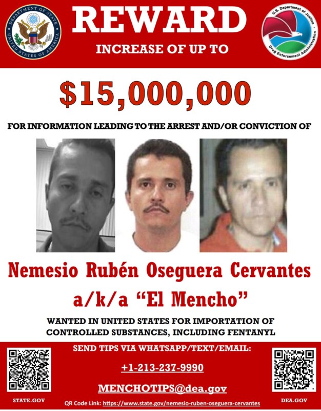 El Mencho tewas dalam operasi militer pada hari Minggu, 22 Februari 2026, yang seketika memicu kerusuhan di setidaknya 20 negara bagian di Meksiko. Departemen Luar Negeri Amerika Serikat sebelumnya telah menawarkan hadiah sebesar $15 juta atau setara dengan Rp251.385.000.000 (kurs Rp16.759) untuk informasi yang mengarah pada penangkapan pemimpin organisasi teroris asing ini. CJNG dikenal memiliki kapasitas perdagangan kokain, heroin, dan fentanil terbesar di wilayah Amerika Utara, yang menjadikannya salah satu ancaman keamanan global yang paling signifikan.