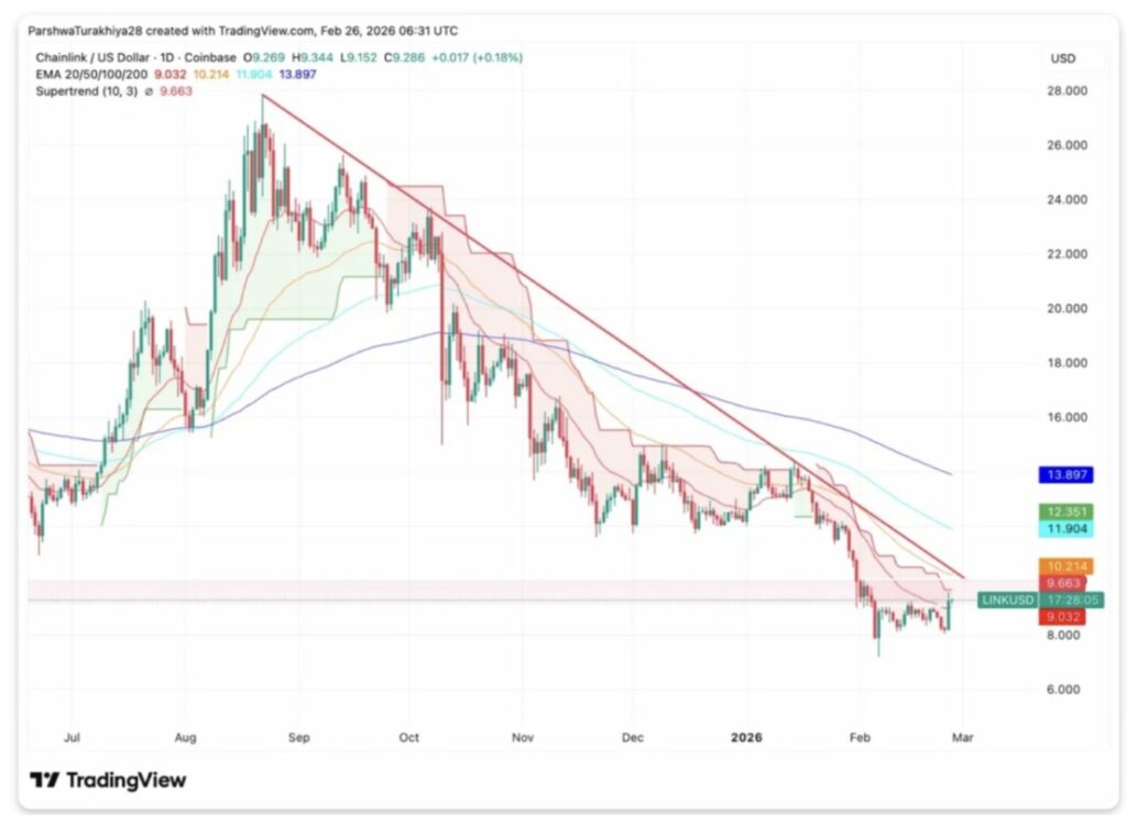 Pada grafik harian (26/2), Chainlink masih bergerak di bawah seluruh moving average utama meskipun sempat memantul dari level terendah terbaru. Posisi indikator yang disebutkan adalah: EMA 20-hari di $9.032, EMA 50-hari di $10.214, EMA 100-hari di $11.904, dan EMA 200-hari di $13.897.