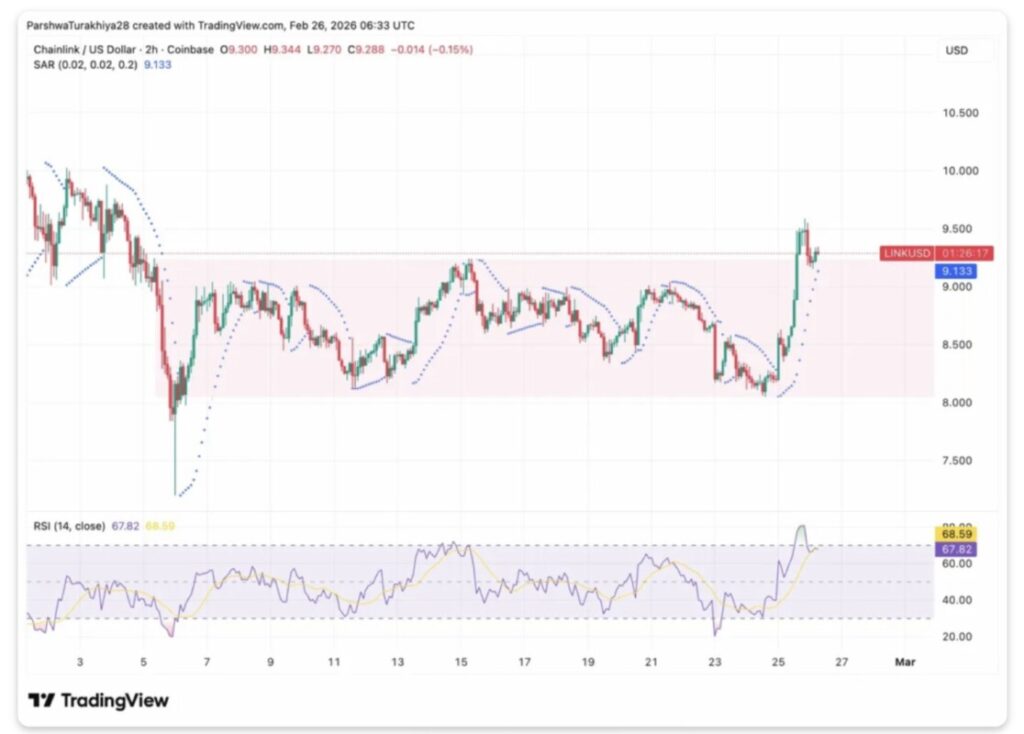 Grafik 2 jam (26/2) menunjukkan Chainlink sedang berkonsolidasi di sekitar $9.30 setelah sempat melonjak ke $9.50 usai pengumuman terkait Canton. Indikator Parabolic SAR berada di $9.133 dan berfungsi sebagai penopang terdekat. Sementara itu, RSI mencapai 67.82, mendekati area jenuh beli (overbought), namun mulai menurun seiring harga memasuki fase konsolidasi.