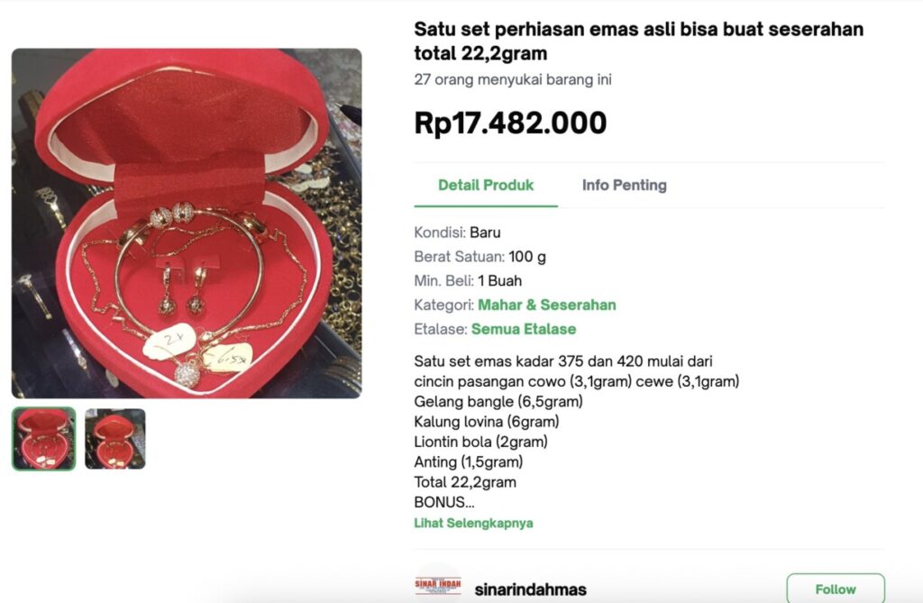 Pada salah satu produk yang ditawarkan di toko Sinar Indah Mas di salah satu e-commerce, satu set perhiasan emas memiliki total berat 22,2 gram. Set tersebut terdiri dari beberapa item perhiasan dengan kadar 375 dan 420. Harga yang tercantum untuk satu set ini adalah Rp17.482.000.