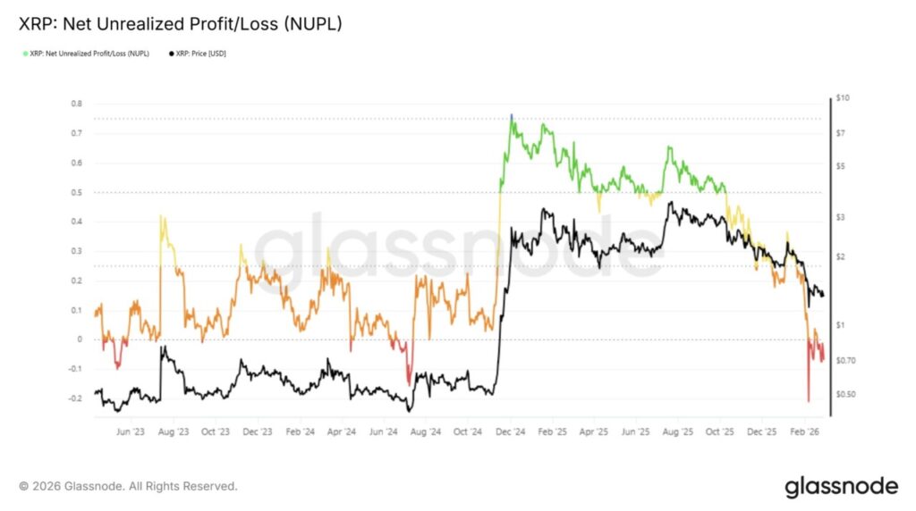 Indikator Net Unrealized Profit and Loss (NUPL) menunjukkan XRP masih berada di wilayah kapitulasinya. Fase ini menandakan mayoritas pemegang masih menanggung kerugian yang belum terealisasi. Kapitulasi umumnya mencerminkan tahap akhir dari tren turun, bukan awal pergerakan penurunan.