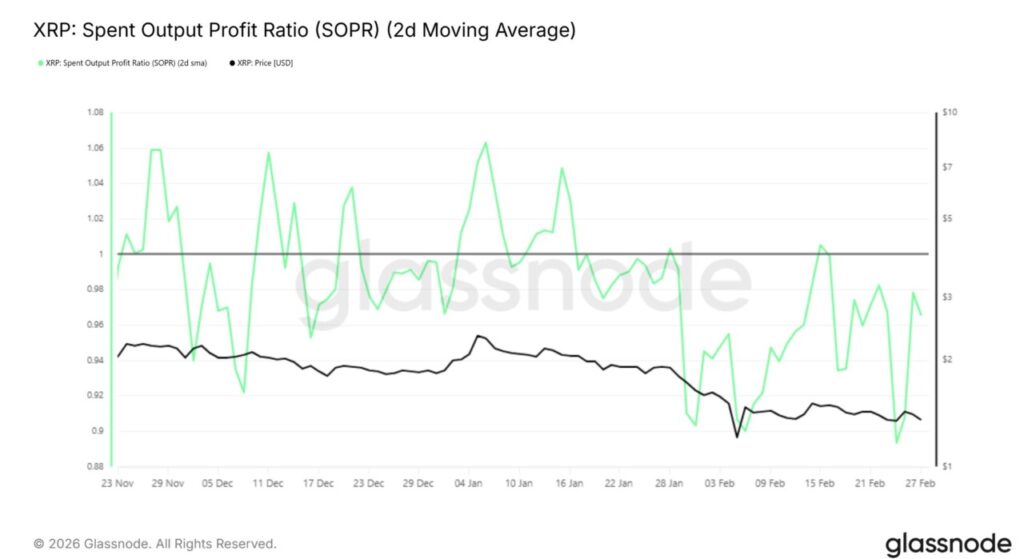 Spent Output Profit Ratio (SOPR) mengonfirmasi bahwa banyak pemegang XRP masih melepas asetnya dalam kondisi rugi. SOPR sempat bergerak singkat di atas level 1 pada pertengahan Februari, yang mengisyaratkan profitabilitas sementara. Namun, metrik tersebut segera turun kembali di bawah 1, menandakan tekanan jual kembali menguat.
