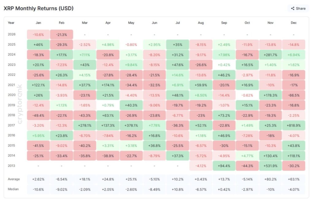 Data musiman menunjukkan bahwa dalam 12 tahun terakhir, bulan Maret memberikan rata-rata imbal hasil sekitar 18% untuk XRP, sehingga secara statistik menjadi bulan terkuat pada kuartal pertama.