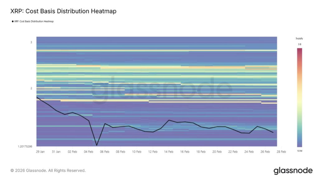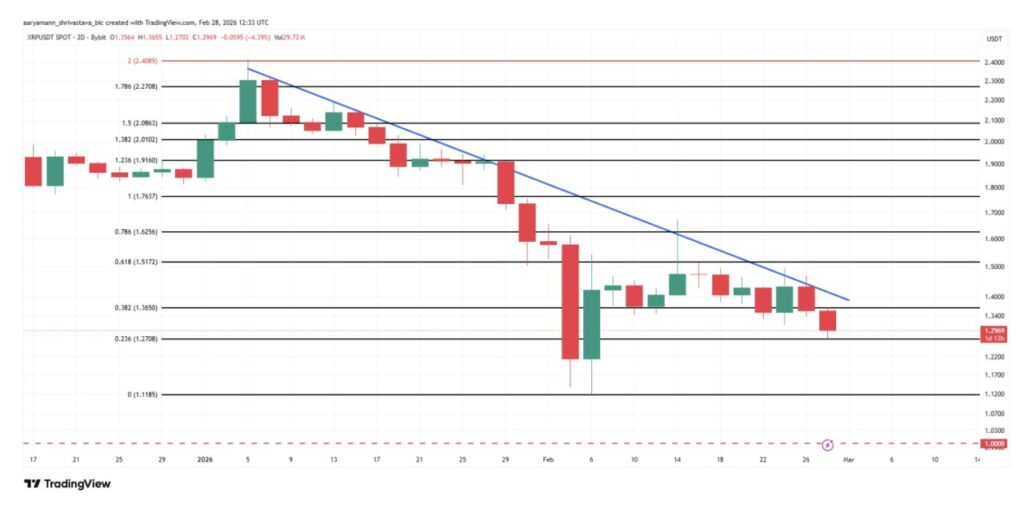Pada 28 Februari, XRP sempat diperdagangkan di $1,29 dan masih bertahan di atas support krusial $1,27. Level ini sejalan dengan retracement Fibonacci 23,6% yang kerap dipandang sebagai “lantai” support pada fase pasar bearish. Mempertahankan area ini penting untuk mencegah koreksi yang lebih dalam.