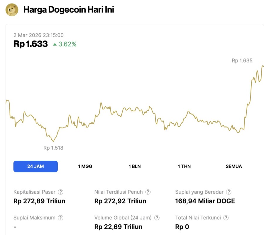Pada 2 Maret 2026, harga Dogecoin tercatat mengalami kenaikan 3,62% dalam waktu 24 jam, diperdagangkan pada harga $0.09686 atau setara dengan Rp1.633. Dalam periode 24 jam terakhir, harga DOGE bergerak dalam kisaran Rp1.518 hingga ke Rp1.635.