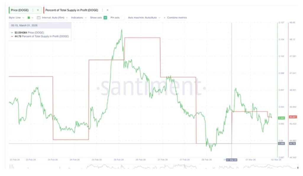 Pada 1 Maret 2026, sekitar 44.79% dari suplai beredar Dogecoin berada dalam kondisi untung. Pada 2 Maret, angkanya naik menjadi 45.6%. Kenaikan ini tampak kecil, tetapi konsekuensinya penting.