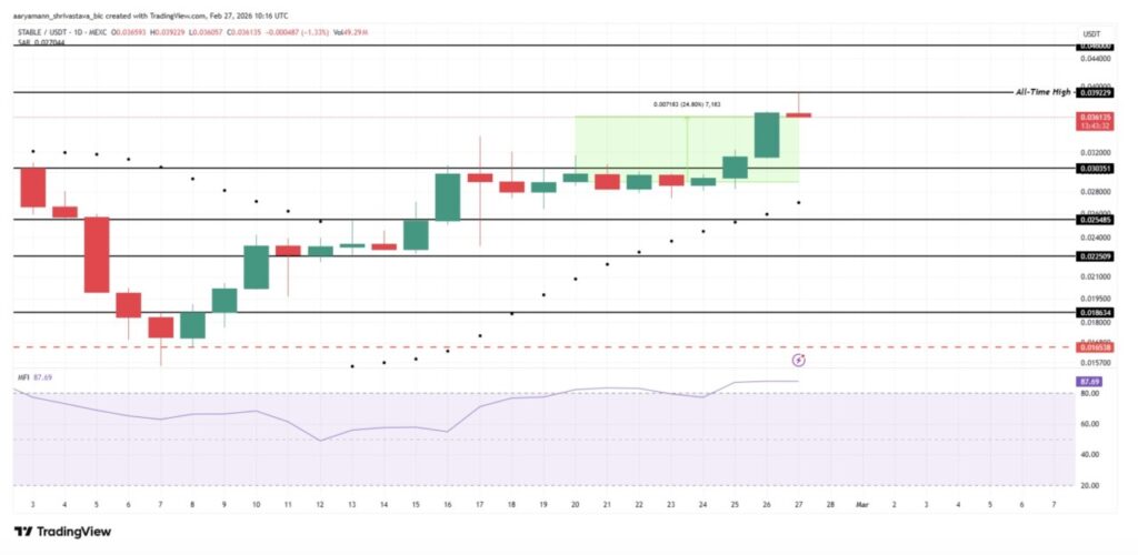 Altcoin lain yang patut diperhatikan akhir pekan ini adalah STABLE. Per 27 Februari, STABLE sempat diperdagangkan di $0.036 setelah sempat mencetak all-time high baru di $0.039 pada perdagangan intraday. Indikator Parabolic SAR masih berada di bawah candlestick, yang menegaskan tren naik saat ini secara teknikal masih terjaga pada kerangka waktu jangka pendek.